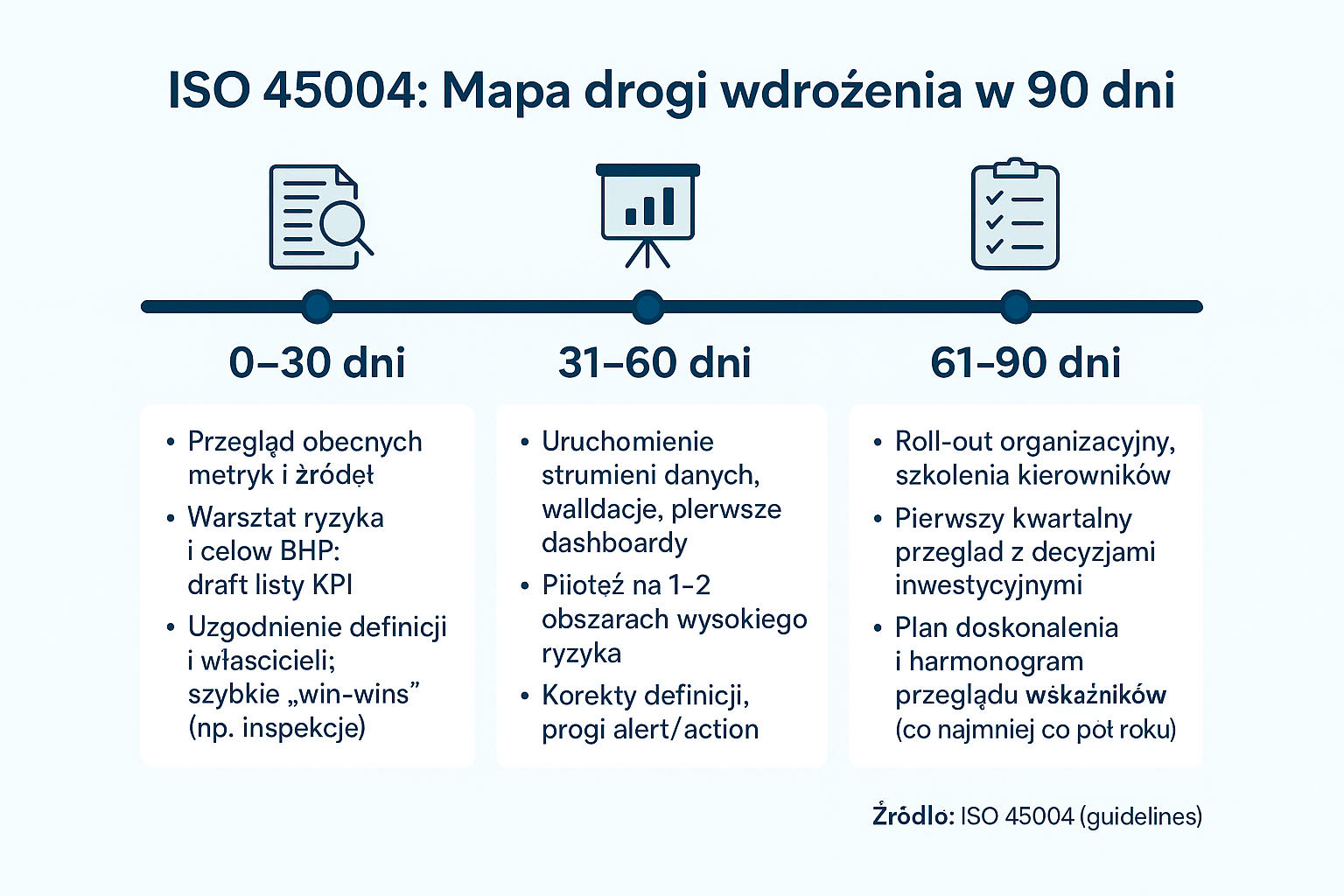 ISO 45004 pomaga przejść od „mierzenia wszystkiego” do mierzenia tego, co zmienia bezpieczeństwo. Jeśli:
